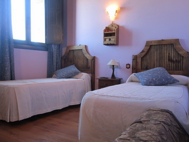Habitacion doble con posibilidad de incorporar camas supletorias o cunas. Precio 40 Euros/noche con desayuno incluido. Ubicada en la segunda planta con un amplio hall, bajo un techo de madera con interesante decoración que distribuye las habitaciones. La decoración acorde con el estilo que el resto del establecimiento.